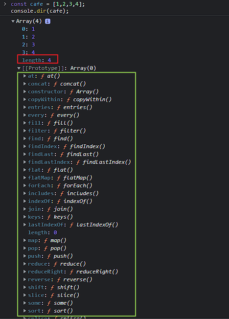 아래 참조 이미지의 초록색박스가 array에서 사용가능한 메소드 리스트이다.